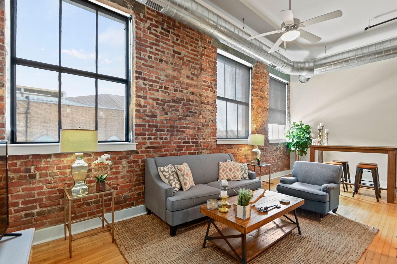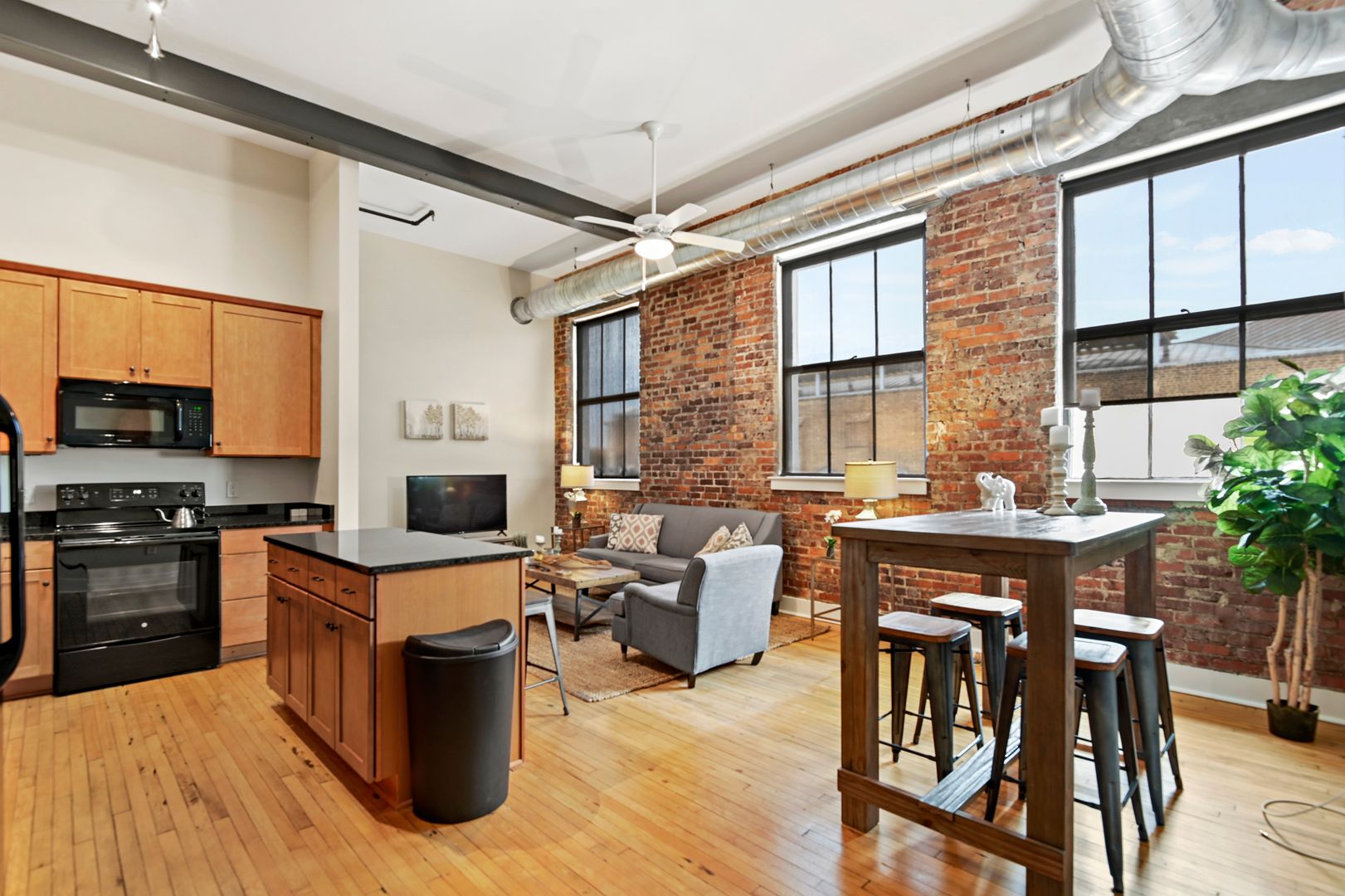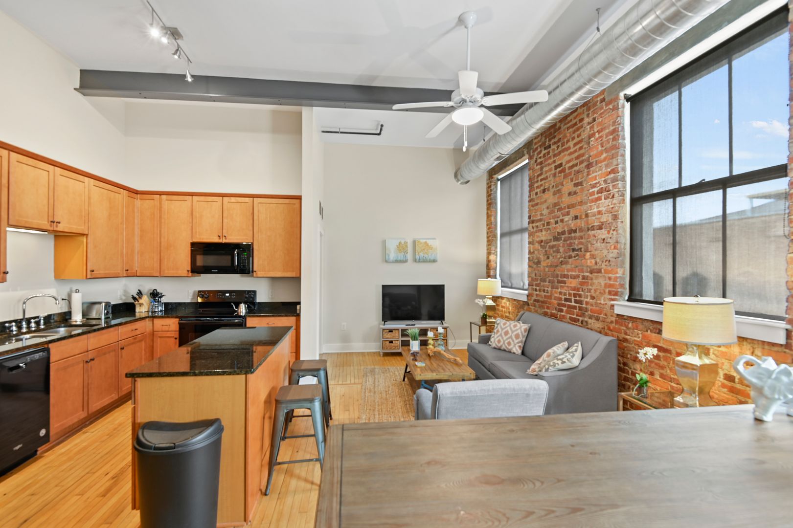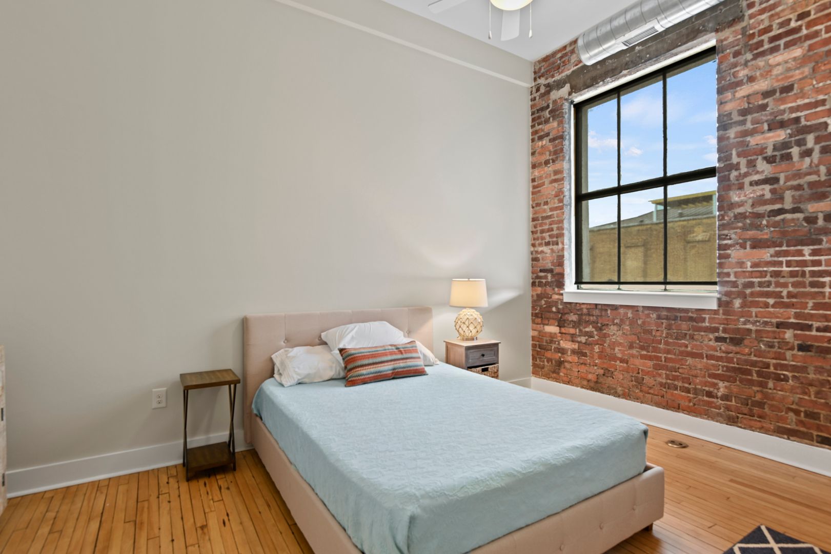 This large two bedroom, two bath residence features a private primary suite and showcases original hardwood floors in the master bedroom and open-concept kitchen/living area. Massive vintage 1920s steel-frame windows flood the space with natural light, highlighting the unique character of this beautifully restored home.