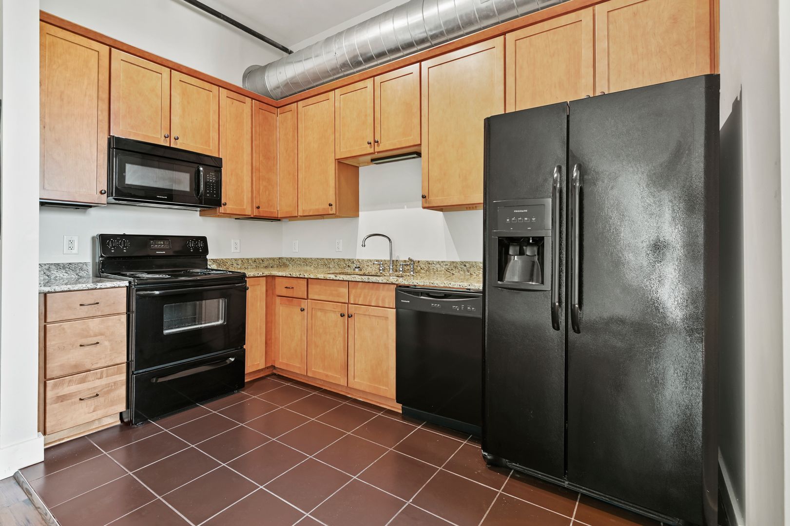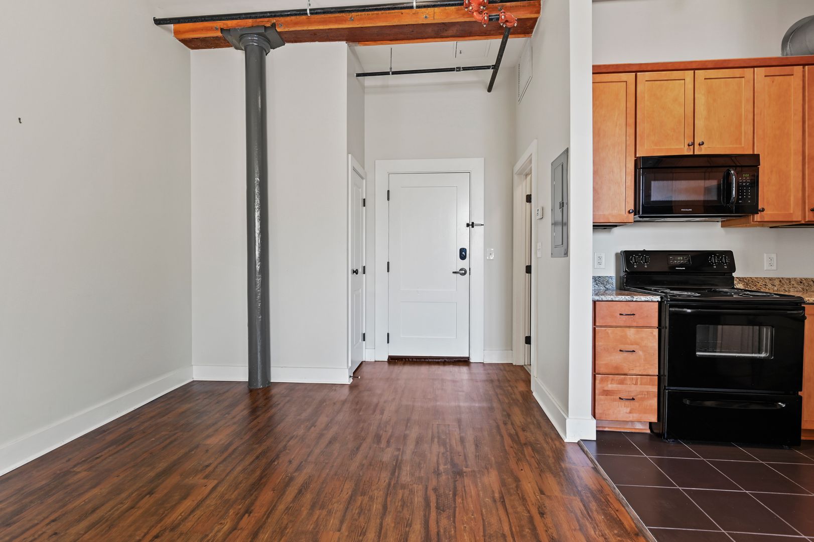 The studio layout includes wood flooring, two closets for storage, a separate bathroom, and an in-unit stacked washer/dryer. The tiled kitchen is equipped with wood cabinetry, granite countertops, and modern appliances—including a full-size refrigerator and dishwasher.