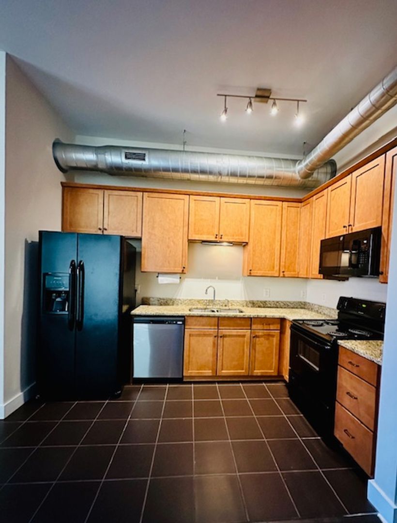 The tiled kitchen is outfitted with wood cabinetry, granite countertops, and full-size appliances—including a side-by-side refrigerator and dishwasher. Thoughtfully designed, the studio allows for easy separation between living and sleeping areas and includes a spacious walk-in closet. The large bathroom features a walk-in shower for added comfort.