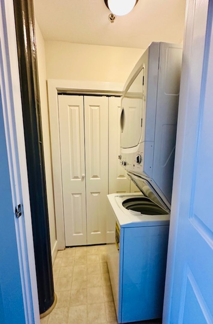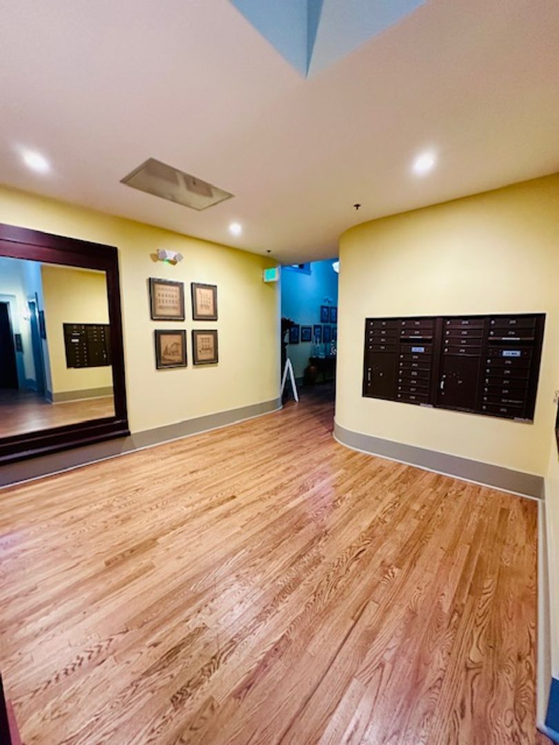In-unit stacked washer/dryer, secure building entry, conference room, indoor bike racks, package room, and direct-access parking.
