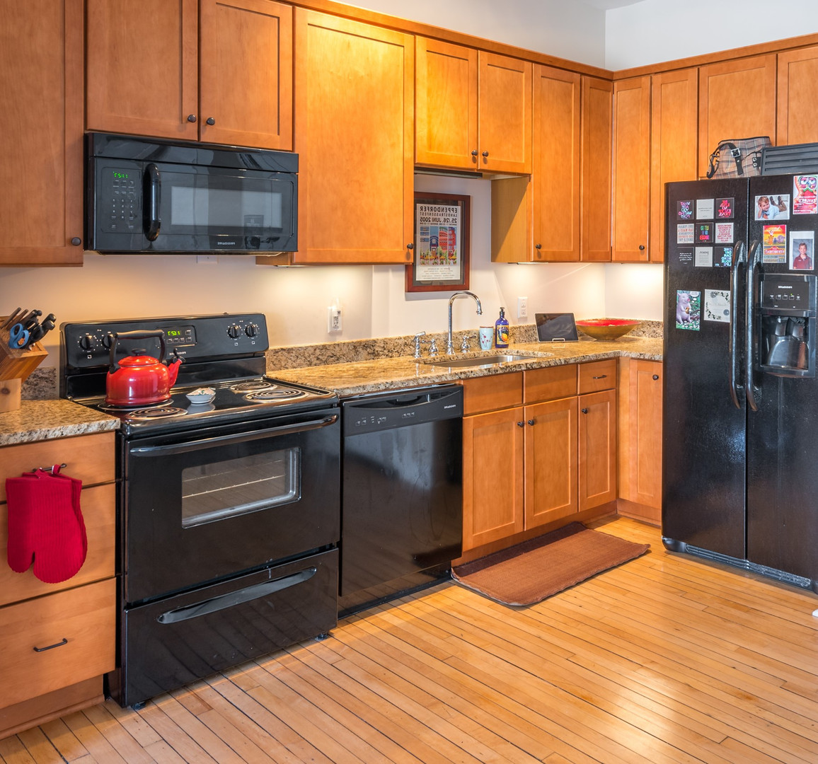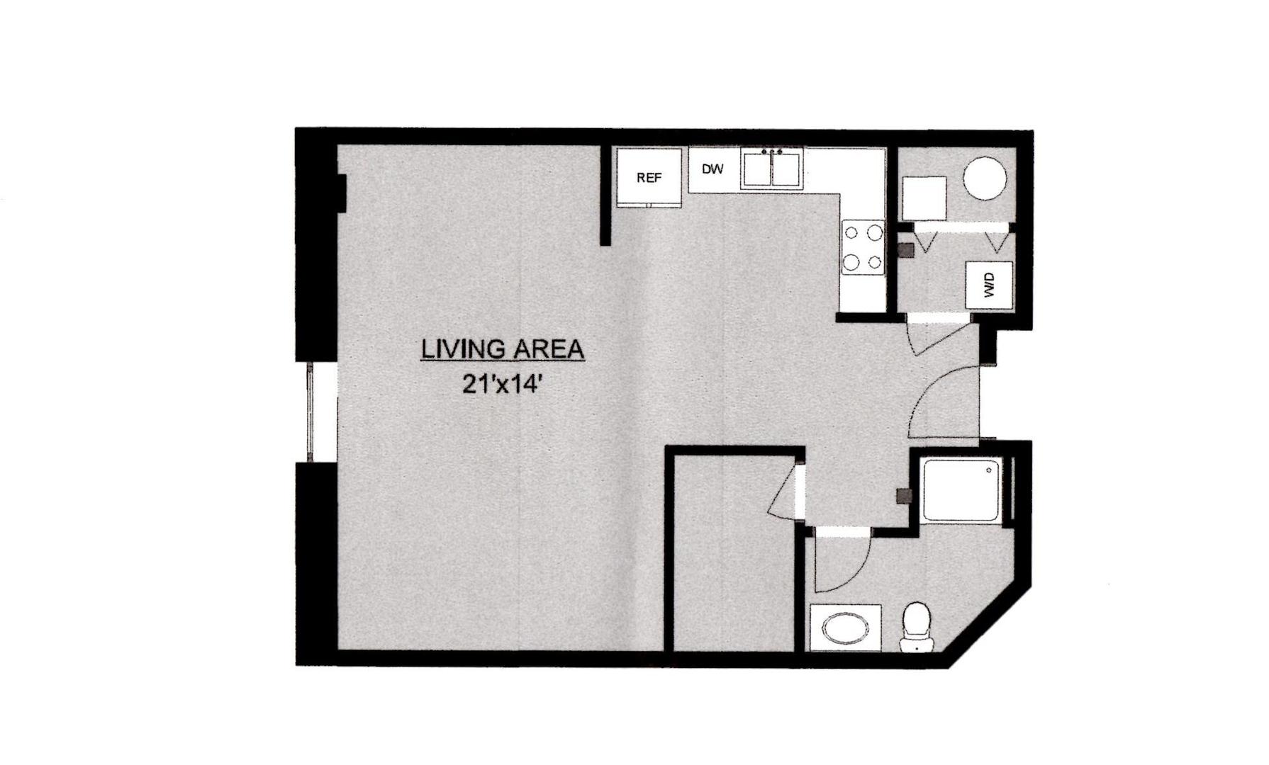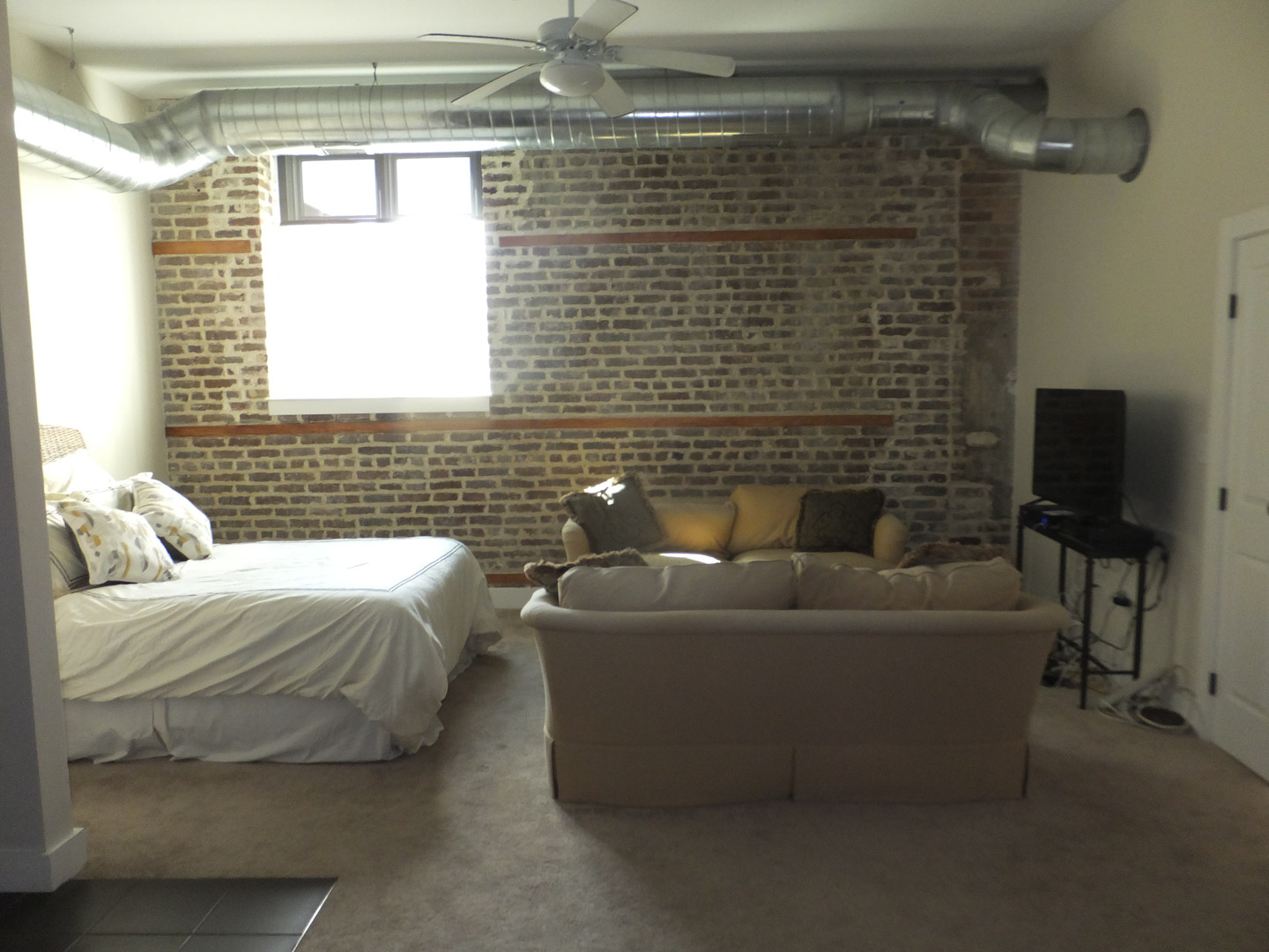 Spacious studio located on the fourth floor, just steps from the bridge to the parking garage. This unit features wood flooring throughout, with tile in the kitchen and bathroom. Enjoy a large walk-in closet offering ample storage, a beautiful casement window, and charming original brick and mortar wall details. The kitchen is equipped with modern appliances, including a full-size refrigerator, and a large stacked washer and dryer.
